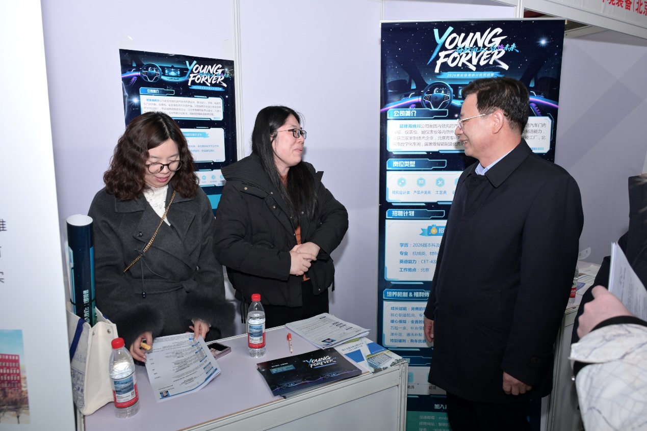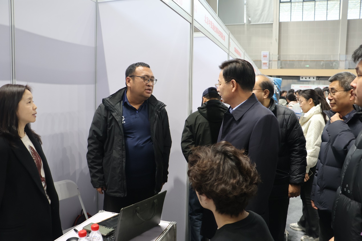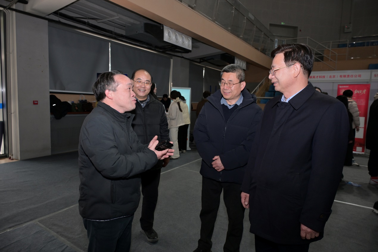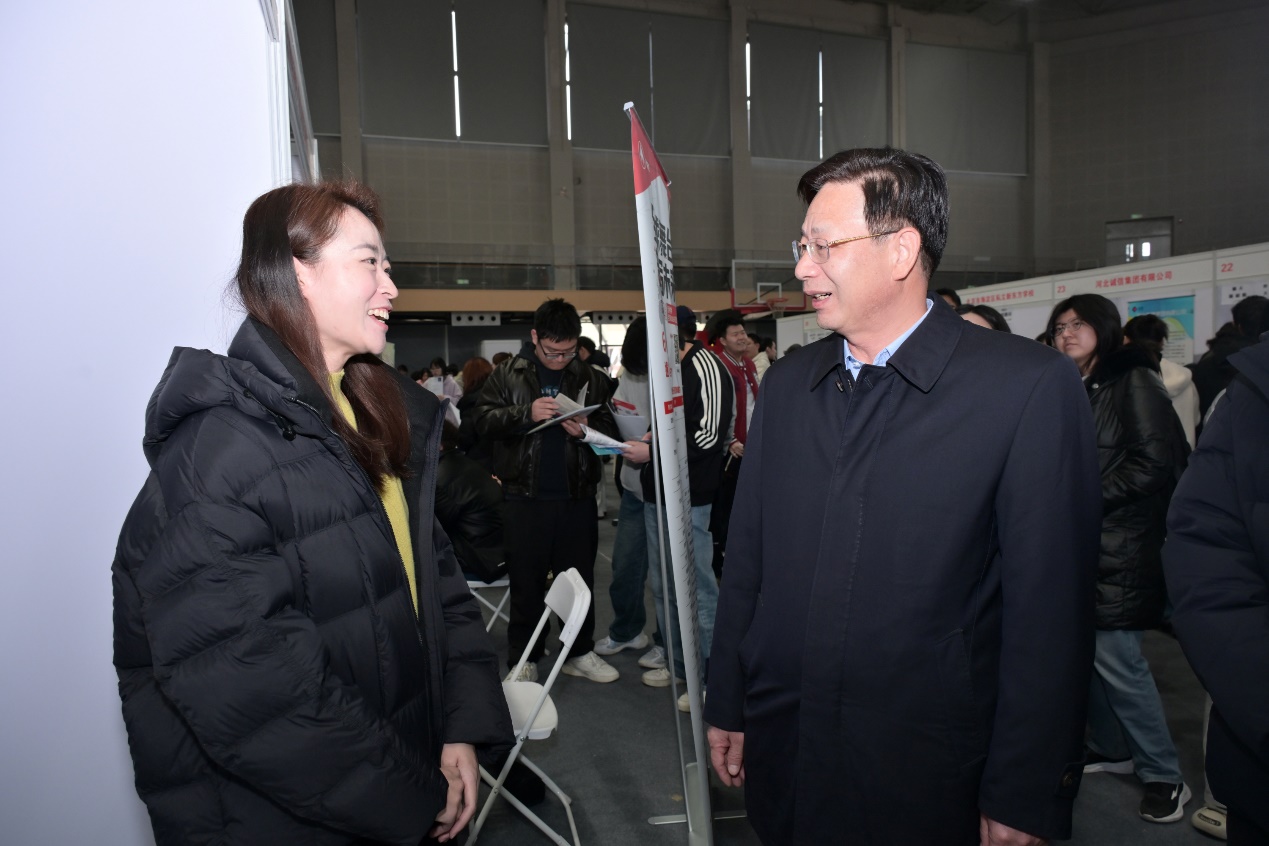 學校黨委書記陳剛、黨委副書記馮學會到招聘會現場視察指導并分別與用人單位負責人交流。