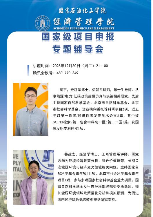 12月30日,經(jīng)濟管理學院舉辦第三場國家級項目申報專題輔導會。本次輔導創(chuàng)新采用同輩輔導模式,邀請院內(nèi)青年骨干教師胡宇、魯建宏,圍繞課題選題、提綱撰寫、科學問題凝練等關鍵環(huán)節(jié)分享實戰(zhàn)心得。會議由李海萍院長主持,20 余名青年教師線上參會。