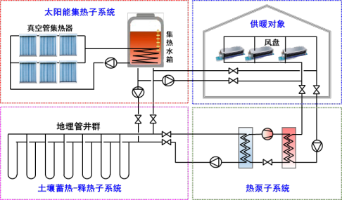 近三年來(lái),在北京市教育委員會(huì)-市自然科學(xué)基金聯(lián)合資助項(xiàng)目(KZ201810017023)等的支持下,我校能源高效利用與清潔能源工程應(yīng)用研究所孫東亮教授牽頭開展了技術(shù)攻關(guān)。項(xiàng)目組結(jié)合京津冀地區(qū)豐富的太陽(yáng)能資源現(xiàn)狀,引入太陽(yáng)能跨季節(jié)蓄熱技術(shù),在春、夏、秋等非供暖季利用太陽(yáng)能對(duì)土壤進(jìn)行補(bǔ)熱增溫,以解決土壤層溫度逐年遞減的難題。同時(shí),還可在供暖季通過(guò)太陽(yáng)能直供以分擔(dān)部分供暖負(fù)荷,從而進(jìn)一步提升了系統(tǒng)供暖能效(如圖1所示)。理論研究方面,項(xiàng)目組基于ANSYS Fluent軟件和用戶自定義函數(shù)(UDF)二次開發(fā),提出了太陽(yáng)能跨季節(jié)土壤蓄熱的簡(jiǎn)化快速計(jì)算方法,大幅縮短了計(jì)算耗時(shí)且具備復(fù)雜工況下的求解穩(wěn)定性。還基于數(shù)值模擬、正交實(shí)驗(yàn)設(shè)計(jì)和支持向量機(jī)(SVM)等方法,構(gòu)建了太陽(yáng)能跨季節(jié)土壤蓄熱性能的快速預(yù)測(cè)模型,將該模型與第二代非支配排序遺傳算法相結(jié)合,開發(fā)了“部件-系統(tǒng)”一體化仿真優(yōu)化技術(shù),指導(dǎo)供暖系統(tǒng)優(yōu)化設(shè)計(jì),制定優(yōu)化運(yùn)行策略,實(shí)現(xiàn)穩(wěn)定高效清潔供暖。