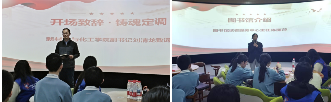 活動當天,北京八中大興分校的60余名師生抵達學校,在志愿者引導下有序進入圖書館401室。活動在主持人肖雅涵、于澤溪的熱情開場中拉開帷幕。新材料與化工學院黨委副書記劉清龍親臨現(xiàn)場并致歡迎辭,他對八中師生的到來表示熱烈歡迎,強調雷鋒精神在新時代的育人價值,鼓勵大中學生攜手共學、互促成長,讓紅色基因在書香浸潤中代代相傳。