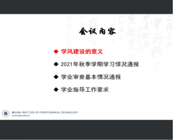 會上,閆偉歌副書記重點從學風建設的重要性、各年級上一學期學習成績情況、學業審查基本情況及學業指導工作要求等方面做了介紹,要求輔導員、班主任加強溝通交流,對所有學生進行深度輔導談心談話,及時了解學生情況,解決學生問題,重點關注學業困難學生,當好學生關鍵成長階段的指導者。