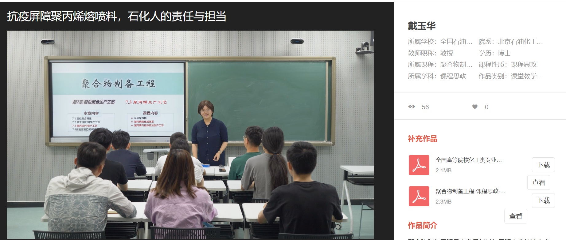 我校戴玉華教授團隊以高分子材料與工程專業的核心課《聚合物制備工程》為參賽課程,深入挖掘課程中涵蓋的課程思政元素。該課程將聚合物制備的基礎知識(聚合原理、生產工藝、影響因素等),與規模化高分子產品生產工藝的設計、改進能力及綠色發展、生態環保的理念進行有機融合,著重培養學生解決復雜工程問題的綜合能力與職業素養。在7月21日的線上說課環節中,戴玉華教授在全面說明整體課程思政設計思路后,逐項展示了參賽提交課程思政教學案例內容,并以“抗疫屏障聚丙烯熔噴料,石化人的責任與擔當”案例為例,詳細介紹了如何在專業課程中開展課程思政。