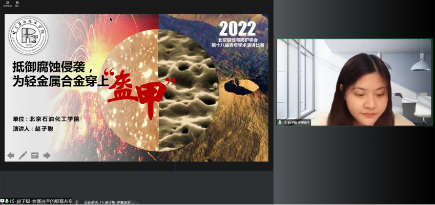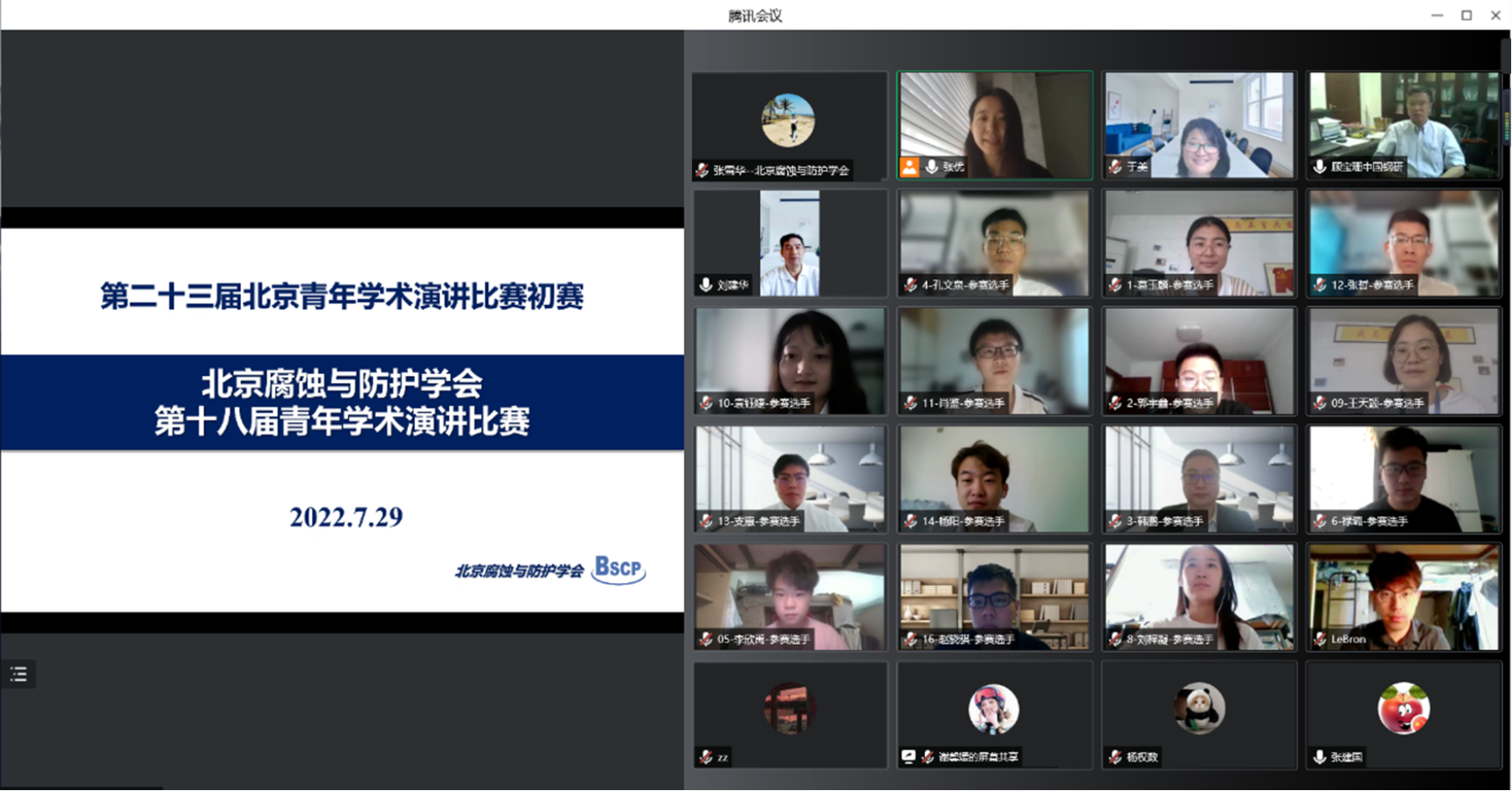 為促進首都青年(學生)之間的學術交流,促進科技人才成長,推動科技創新與發展,2022年7月29日,北京腐蝕與防護學會通過騰訊會議在線上舉辦了主題為“弘揚科學家精神,彰顯科技界擔當”的第十八屆青年學術演講比賽。此次活動為2022年北京市科協第二十三屆北京青年學術演講比賽的預選賽,以期通過學術與演講相結合的方式,展示青年科技工作者的學術風采,幫助青年科技工作者成長成才,為服務首都科技創新發展,助力北京國際科技創新中心建設做出貢獻。本次大賽特邀北京腐蝕與防護學會理事長顧寶珊教授、副理事長劉建華教授、副秘書長于美教授、副秘書長張雪華高工擔任評委。張優副教授作為北京腐蝕與防護學會理事主持了此次大賽。來自北京航空航天大學、北京石油化工學院、中國航發北京航空材料研究院、北京工商大學、中國礦業大學(北京)、北京科技大學、北京有色金屬研究總院等高校與研究機構的16名腐蝕防腐領域的優秀青年科技工作者參賽。