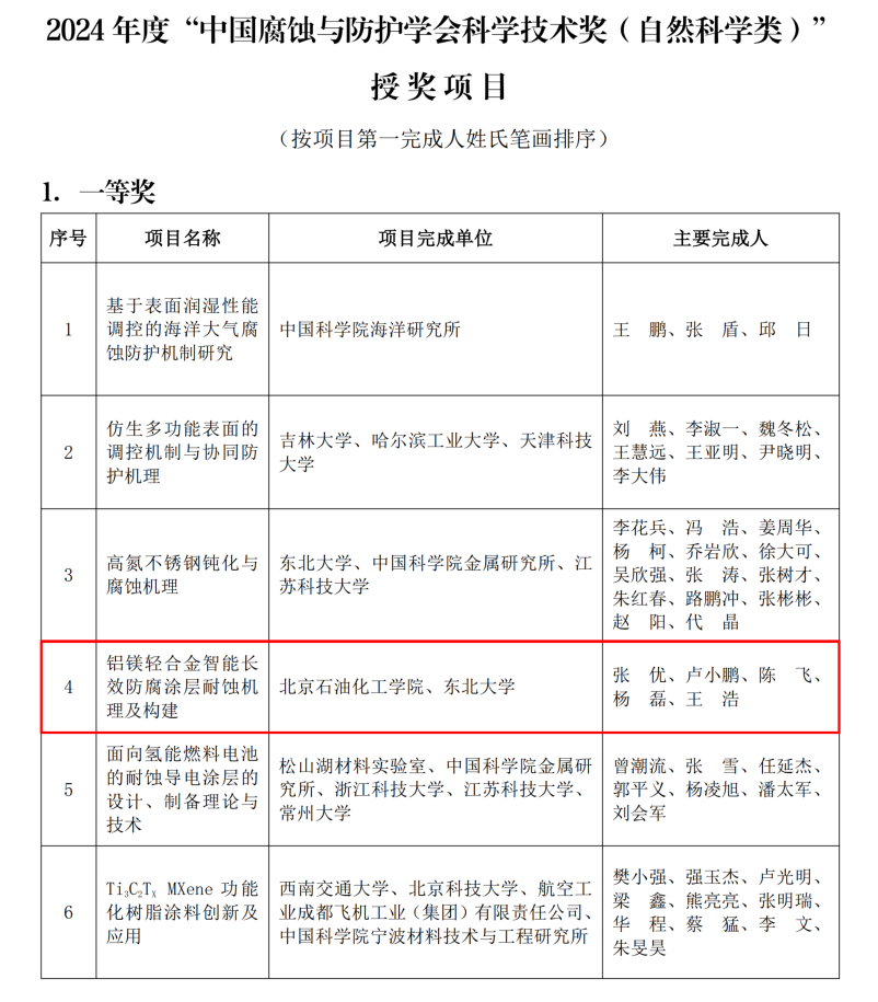該獎項是新材料與化工學院繼2023年度牽頭獲得 “中國腐蝕與防護學會科學技術獎”(科技進步類)一等獎之后,在基礎研究領域繼續發力獲得的又一個重要獎項,是對我校在腐蝕與防護領域貢獻的高度認可,充分體現了相關研究成果在學術界和行業中的重要地位。